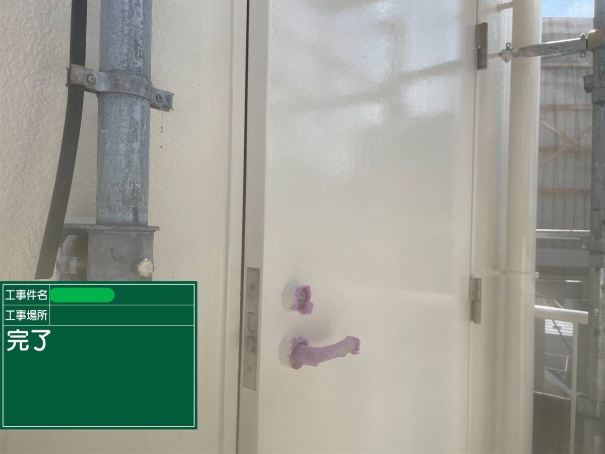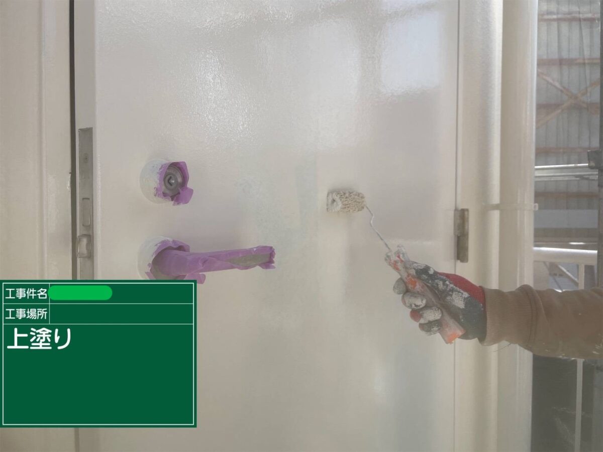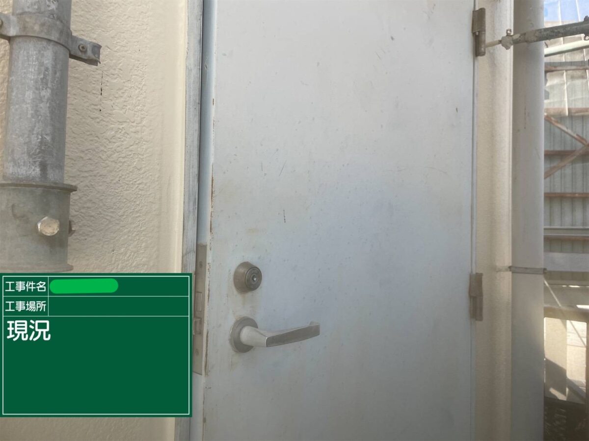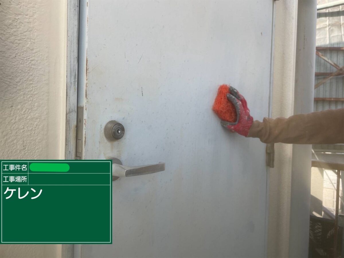 鉄扉の塗装になります。既存の鉄扉の状態ですが、錆びている箇所や凹んでいる箇所などは、ありませんでしたが、経年劣化により、退色しておりました。まずは、目粗しのケレン作業をおこないます。目粗しの作業をおこなうことで、表面に細かなキズが入り、このキズに塗料が入り込むことで、塗料の密着力が高まりますので、塗装前の重要な工程となります。今回の塗装では、防錆形塗料のファインSiを使用です。1液エポキシ錆止めを含む3工程仕様と同等の防食性能がある塗料になりますので、下塗りの錆止めの塗装の必要がなく、中塗り塗装・上塗り塗装の2回塗りで仕上げることが出来ますので、工期短縮にもつながる塗料になり、シリコン系塗料になりますので、一般的なウレタン系塗料より高い耐候性が期待できる塗料になりますので、鉄扉の塗装などにおススメの塗料となっております。