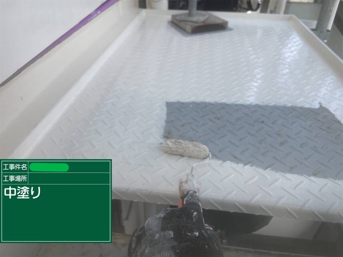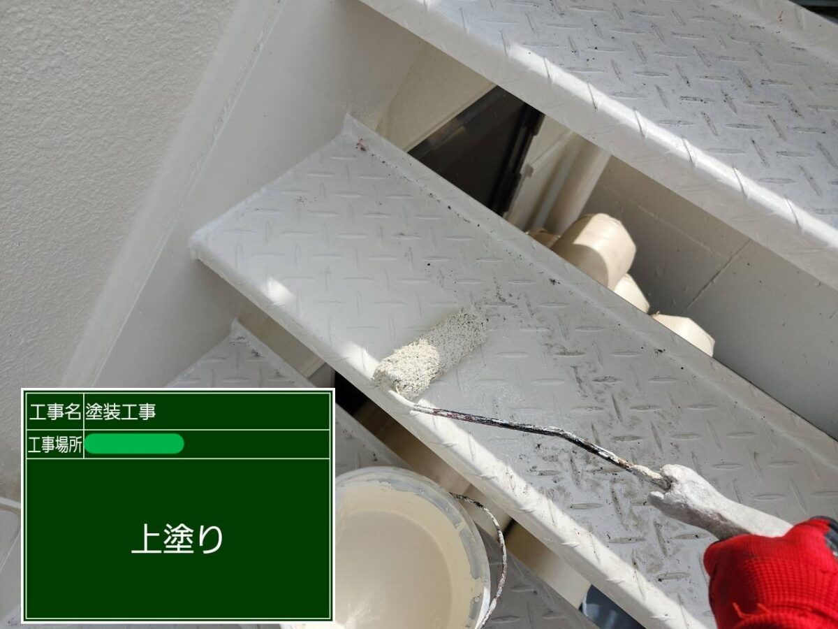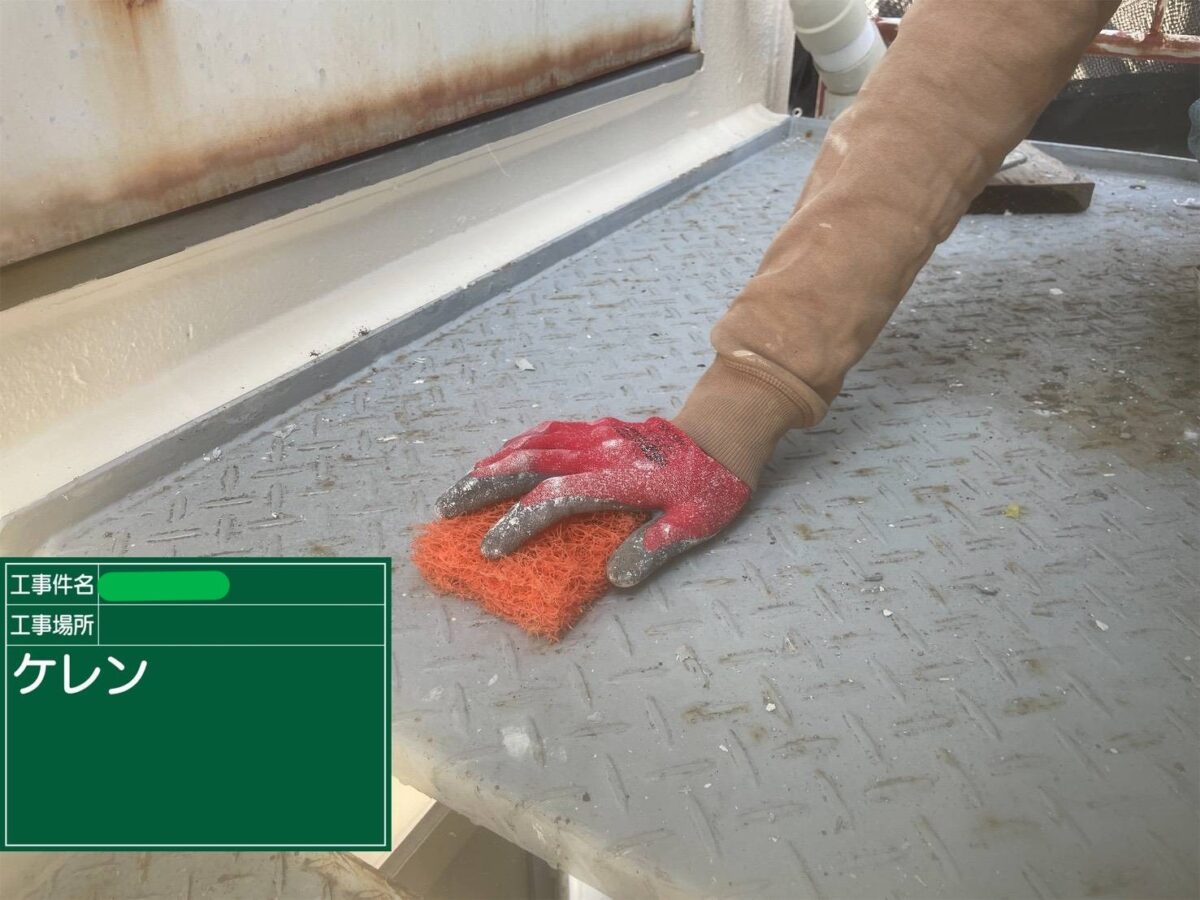 鉄骨階段の塗装になります・既存の鉄骨階段の状態ですが、錆びている箇所や腐食している箇所などは、ありませんでしたので、まずは、全体のケレン作業をおこないます。鉄扉同様に、鉄骨階段も防錆形塗料で仕上げます。日本ペイントの防錆形ファインSiの耐用年数ですが、12~15年前後とされておりますので、鉄扉や鉄骨階段などの塗装におススメの塗料となっております。