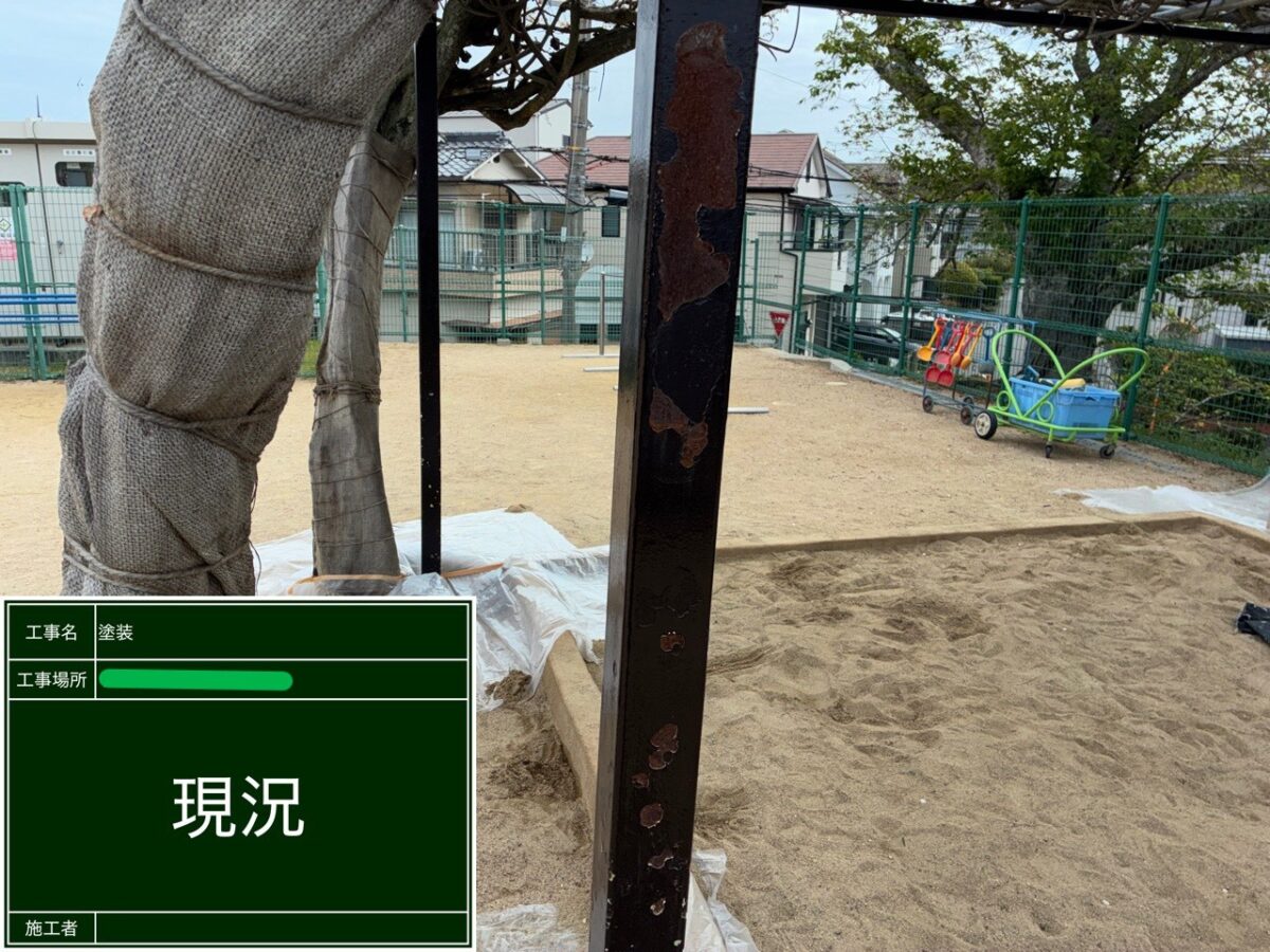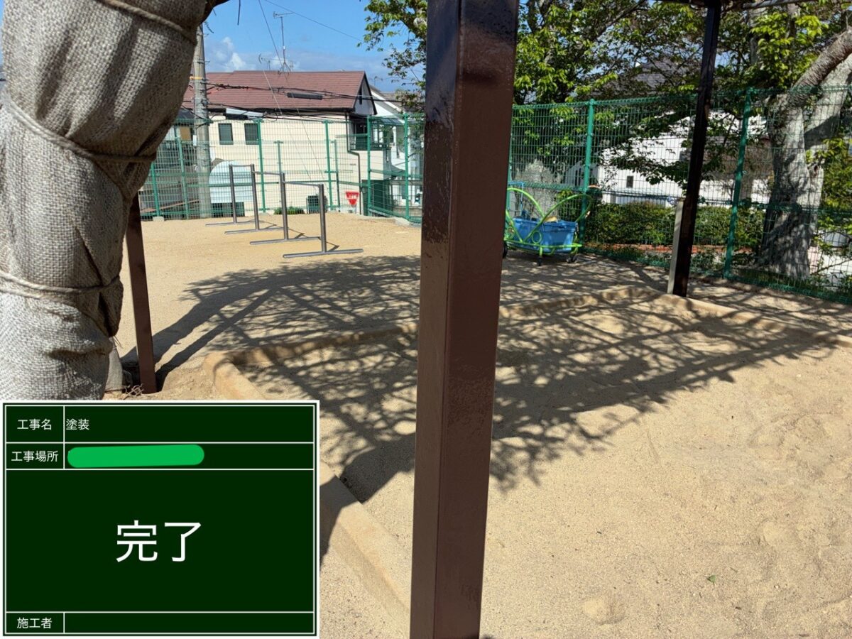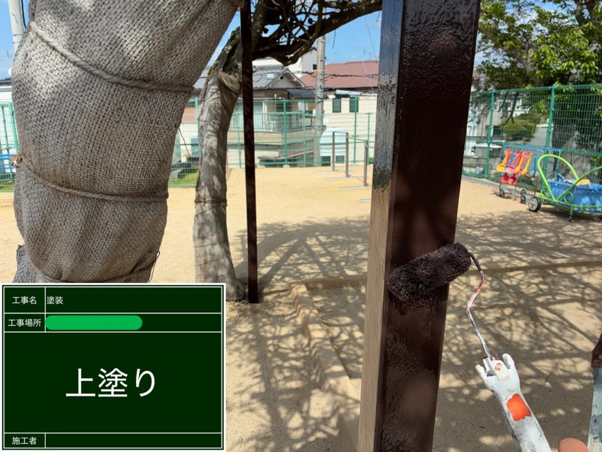 今回の施工場所は、保育園の砂場の藤棚の鉄骨支柱の塗装になります。既存の支柱の状態は、今まで何度も塗り重ねている状態で、塗膜が分厚くなっている状態でした。子供達の手に触れる部分が特に塗膜が捲れていましたので、今回のケレン作業では、グラインダーを使用し、旧塗膜を出来るだけ取り除き、子供達が触れてもケガをしない状態までケレン作業をおこないました。続きまして、下塗りの錆止めの塗装になります。日本ペイントの1液のハイポン・ファインデグロを使用です。塗料の特徴は、2液変性エポキシ塗料と同等の防錆性能があり、錆の進行をしっかりと抑えます。1液タイプで取り扱いやすく、速乾性が高い特徴があり、幅広い下地(鉄・ステンレス・アルミ・亜鉛メッキ・FRP)などに塗装可能な錆止め塗料になります。上塗り材は、同じく日本ペイントのシリコン塗料のファインSiを使用です。ファインSiは紫外線や雨・風に強く、約10~13年程度の耐久性があります。隠ぺい性が良く、塗りムラになりにくく、低汚染性の機能があるのも特徴です。環境・安全性が高く、鉛など重金属を含まない・F☆☆☆☆(室内使用レベルの安全性)があります。下塗りの錆止めの塗装と合わせて、3回塗装で、鉄骨支柱の塗装を仕上げました。施工前は、手で触るとボコボコした手触りでしたが、施工後は、ツルツルした手触りになりましたので、これで、子供達も安全に砂遊びが出来ますね!