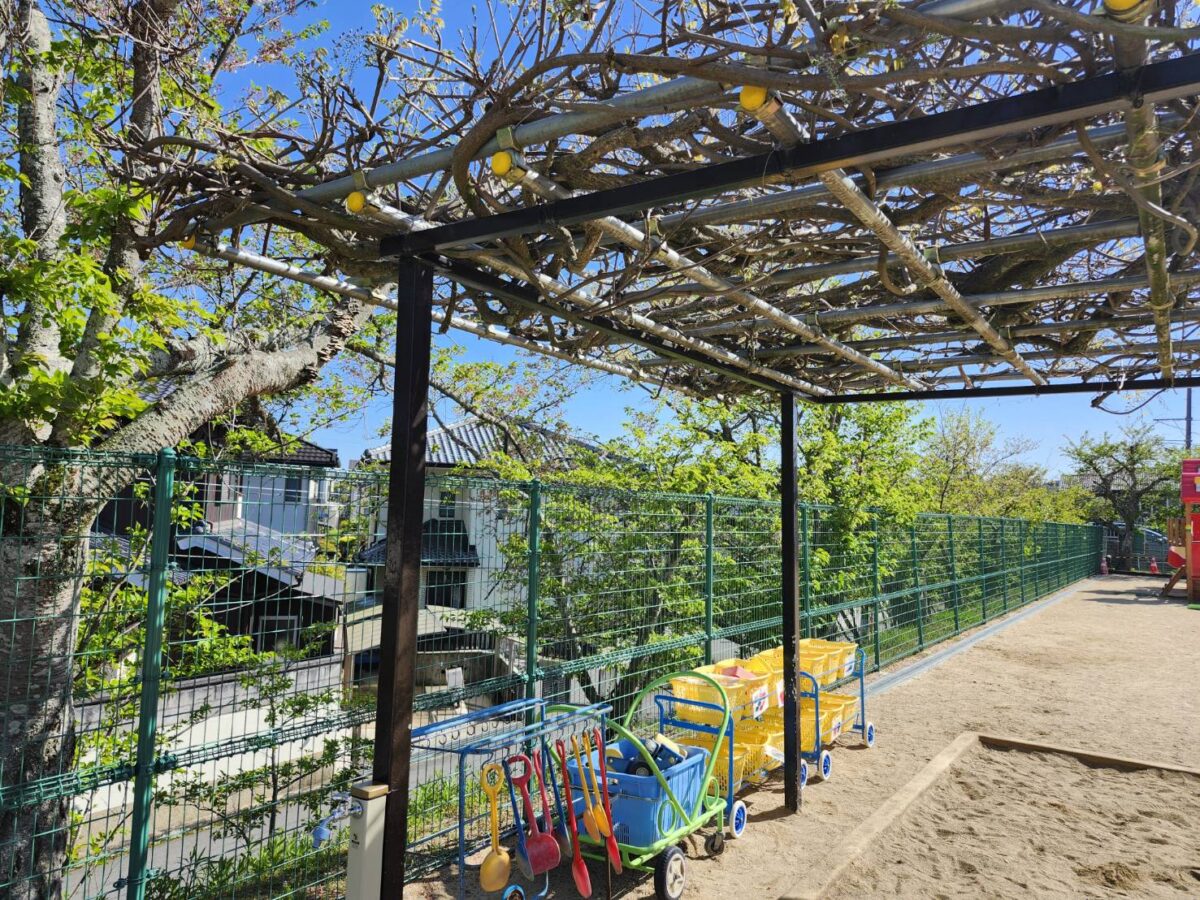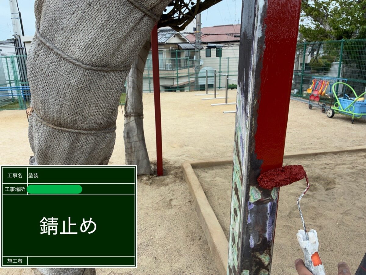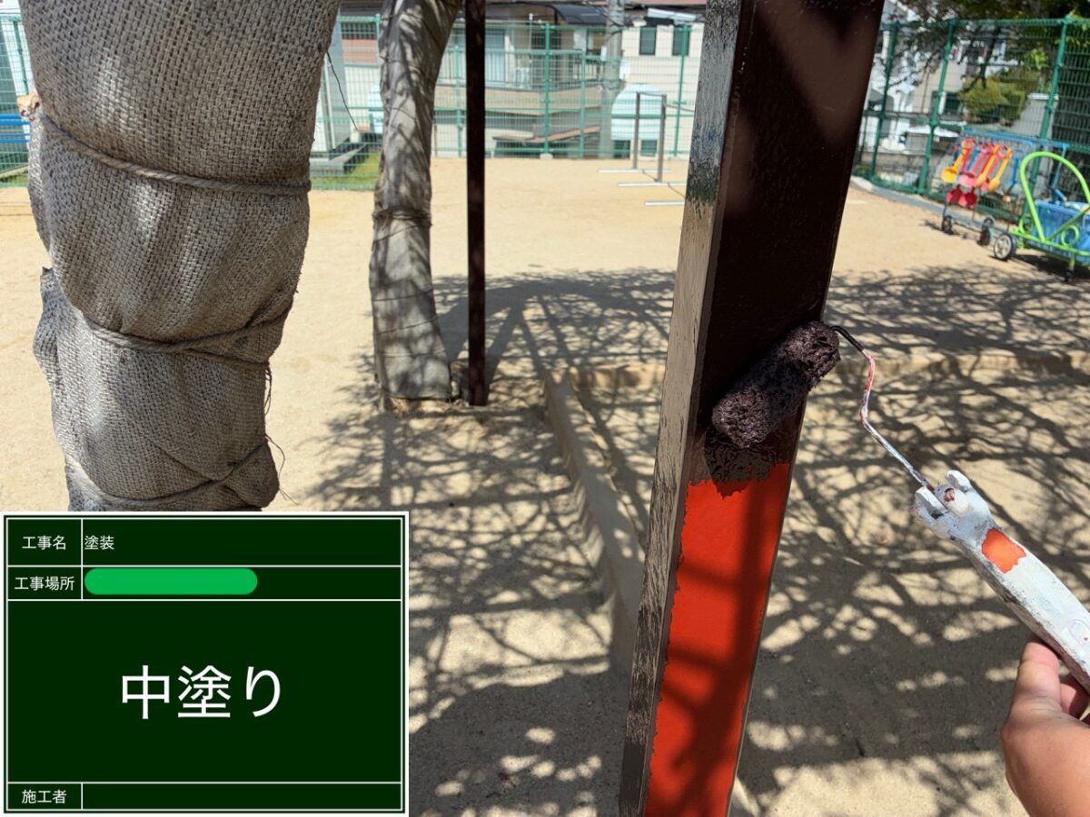 今回の施工場所は、保育園の砂場の藤棚の鉄骨支柱の塗装になります。既存の支柱の状態は、今まで何度も塗り重ねている状態で、塗膜が分厚くなっている状態でした。子供達の手に触れる部分が特に塗膜が捲れていましたので、今回のケレン作業では、グラインダーを使用し、旧塗膜を出来るだけ取り除き、子供達が触れてもケガをしない状態までケレン作業をおこないました。続きまして、下塗りの錆止めの塗装になります。日本ペイントの1液のハイポン・ファインデグロを使用です。塗料の特徴は、2液変性エポキシ塗料と同等の防錆性能があり、錆の進行をしっかりと抑えます。1液タイプで取り扱いやすく、速乾性が高い特徴があり、幅広い下地(鉄・ステンレス・アルミ・亜鉛メッキ・FRP)などに塗装可能な錆止め塗料になります。上塗り材は、同じく日本ペイントのシリコン塗料のファインSiを使用です。ファインSiは紫外線や雨・風に強く、約10~13年程度の耐久性があります。隠ぺい性が良く、塗りムラになりにくく、低汚染性の機能があるのも特徴です。環境・安全性が高く、鉛など重金属を含まない・F☆☆☆☆(室内使用レベルの安全性)があります。下塗りの錆止めの塗装と合わせて、3回塗装で、鉄骨支柱の塗装を仕上げました。施工前は、手で触るとボコボコした手触りでしたが、施工後は、ツルツルした手触りになりましたので、これで、子供達も安全に砂遊びが出来ますね!
