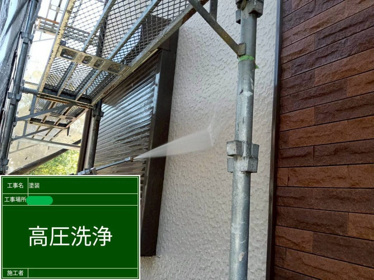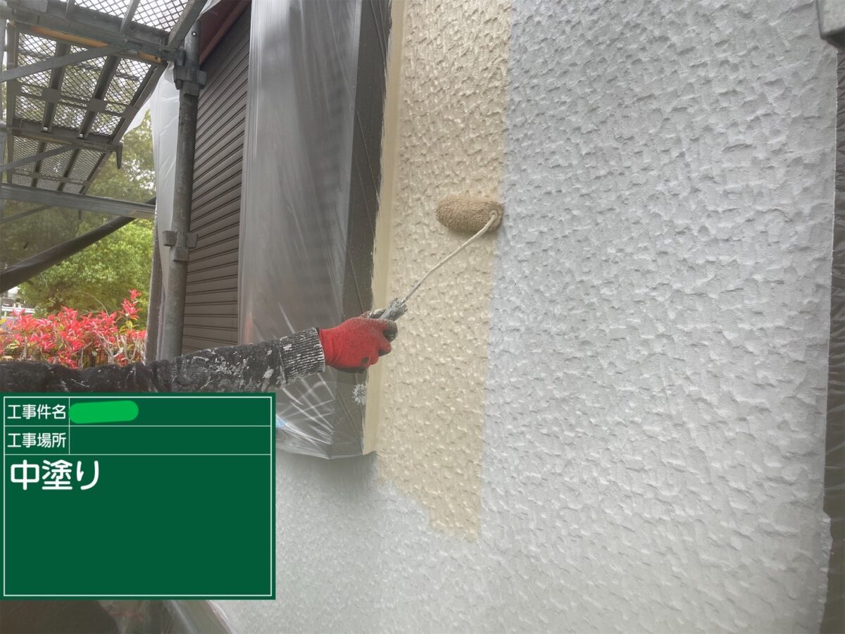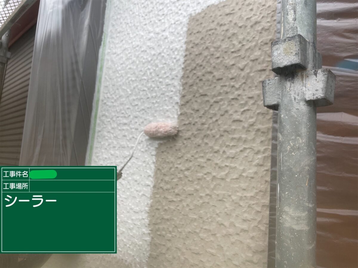 養生の作業が完了しましたので、続きまして外壁の塗装になります。今回、塗装するのは窯業サイディングの外壁の塗装になります。既存の外壁は、大きなクラックや欠損などはありませんでしたので、塗装の工程となり、下塗りのシーラーの塗装になります。下塗り材は、アステックペイントのエポパワーシーラーを使用です。微細な樹脂(マイクロエマルション)が使われており、外壁の内部まで深く浸透して固着します。劣化した下地を補強し、塗膜の剥がれを防ぐ効果があります。また、エポキシ樹脂とカチオン(+電荷)の特性により、マイナス電荷を持つ、下地と電気的にも結びついて密着性が向上します。下地の吸い込みを均一にすることで上塗り材の仕上がりを安定させる効果もあります。中塗り塗装と上塗りの塗装には、同じく、アステックペイントの超低汚染リファイン1000Si-IRの、サンダルウッド色を使用です。塗料の機能は、超低汚染性・高耐候性・遮熱性・防藻・防カビ性の機能があり、塗料をわかりやすく説明すると、超低汚染リファイン1000Si-IRは、外壁が汚れにくく、雨で外壁がセルフクリーニング機能で綺麗になり、約15年~18年の耐候年数があり、美観を長く保つ塗料になりますので、一般的なシリコン塗料よりも耐候年数が長く、外壁の塗装におススメの塗料になります。