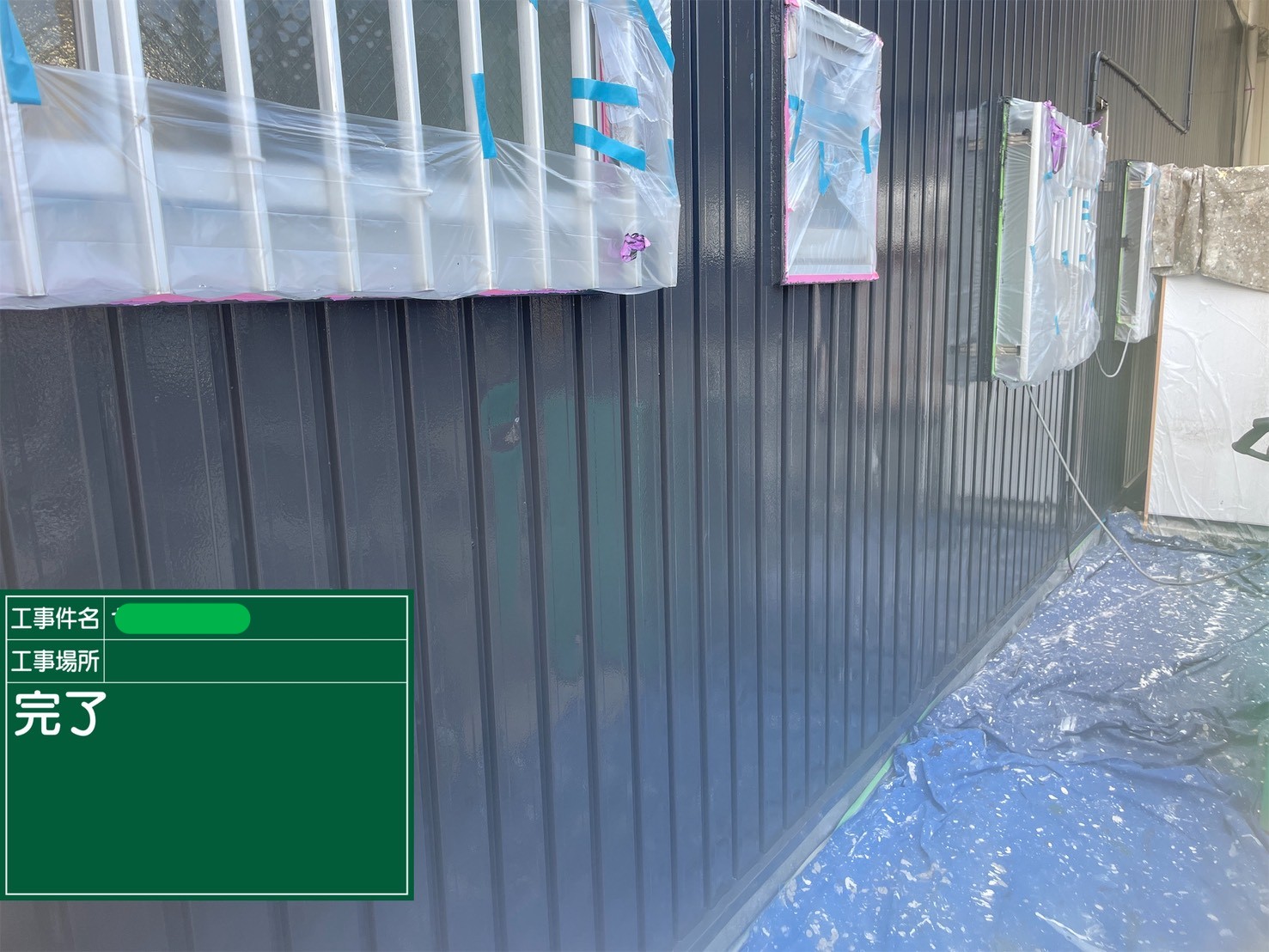 上塗りの塗装です。中塗りと同じ日本ペイントのファインSi・ND-155を使用し上塗りの塗装を行います。防錆性がある塗料になりますので、1液変性エポキシ樹脂系の錆止めを塗装した仕様と同等の性能がある塗料になりますので、中塗り・上塗りの2回塗装で今回の鉄板の外壁を仕上げました。期待耐候年数は10~12年になります。