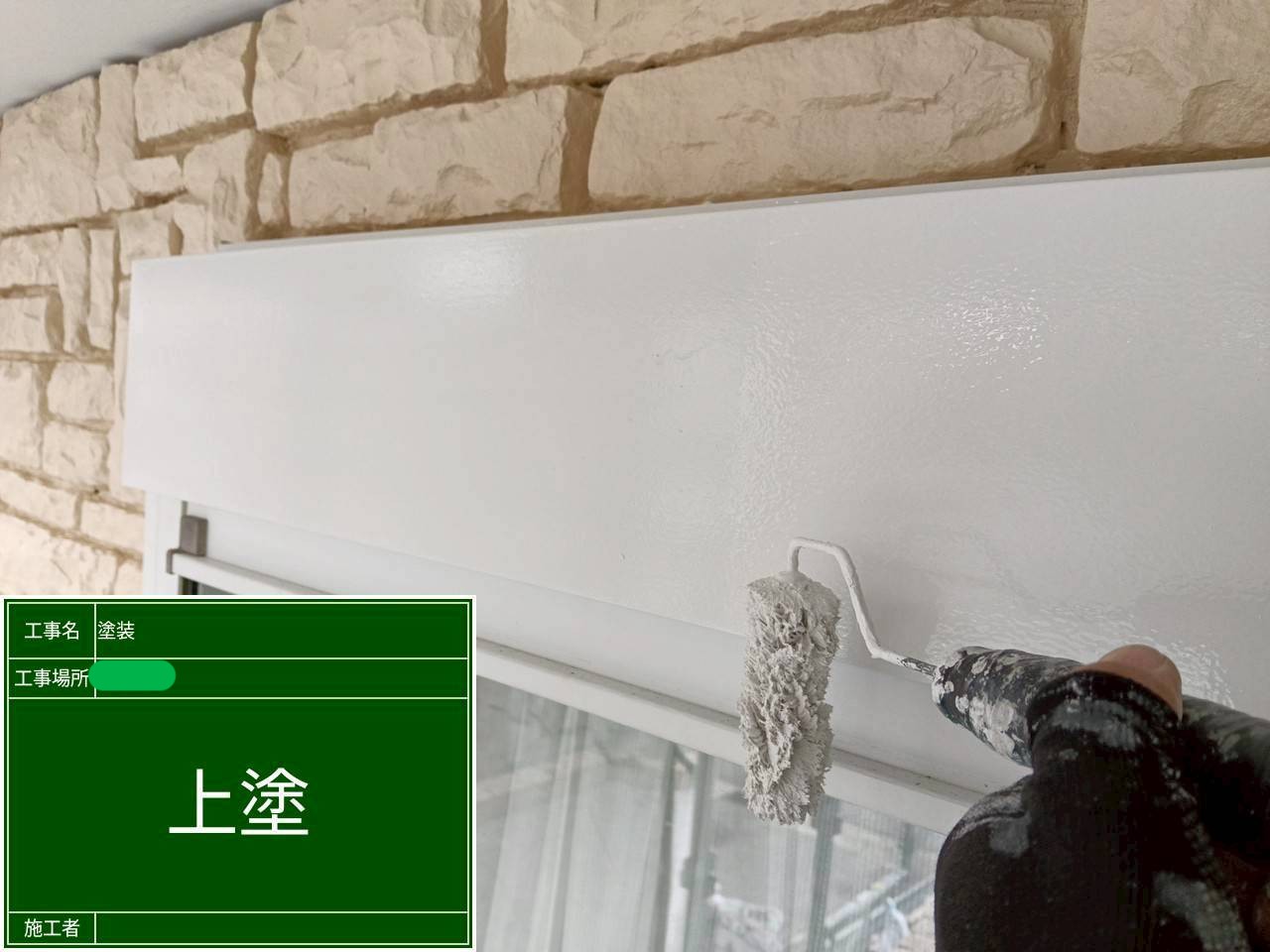 外壁の中塗りの塗装になります。今回の外壁塗装ですが、施主様のご希望により、既存色で塗り替えをご希望されておられましたので、現場にて現在の外壁の色に一番色の近い外壁色を選びました。使用塗料はアステックペイントのフッ素REVO1000-IRのブロークンホワイトとアイアンバーグを使用です。期待耐用年数は16年~20年となっておりますので、シリコン塗料の上のグレードの塗料になります。